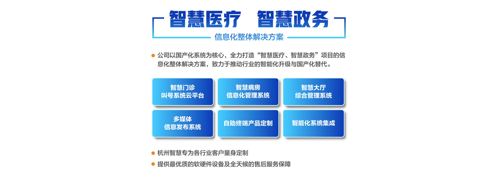 杭州智慧科技有限公司初創(chuàng)于2003年,總部位于重要的電子商務(wù)中心中國杭州公司主營業(yè)務(wù)有:智慧分診叫號系統(tǒng)、智慧病房醫(yī)護(hù)對講系統(tǒng)、智慧大廳綜合管理系統(tǒng)、智慧政務(wù)管理系統(tǒng)、智慧多媒體信息發(fā)布系統(tǒng)、導(dǎo)診系統(tǒng)及各自助終端產(chǎn)品定制。專為各行業(yè)客戶量身定制。公司已有20余年行業(yè)經(jīng)驗(yàn)沉淀積累,擁有優(yōu)秀的產(chǎn)品外觀設(shè)計師和各類中高級專業(yè)技術(shù)工程師,確保所研發(fā)的產(chǎn)品具有行業(yè)領(lǐng)先的外觀及可靠的技術(shù)性能。并擁有權(quán)威部門頒發(fā)的各類知識產(chǎn)權(quán)及專利證書,30多項(xiàng)資質(zhì)證書、800多個合作伙伴、2000多個項(xiàng)目成功案例經(jīng)驗(yàn)。 智慧產(chǎn)品已遍及全國各醫(yī)療、政務(wù)、金融、通訊、公安、工商、稅務(wù)等行業(yè),形成以“立足杭州、輻射長三角、拓展全國”的戰(zhàn)略發(fā)展格局,產(chǎn)品經(jīng)過歷年不斷創(chuàng)新,形成專業(yè)化、平臺化,致力于成為智慧產(chǎn)品的領(lǐng)軍企業(yè)。 公司建立了完善的技術(shù)培訓(xùn)及售后服務(wù)中心,并設(shè)24小時熱線咨詢電話解答用戶反饋的問題。同時應(yīng)客戶要求定期派技術(shù)人員到 全國各地進(jìn)行技術(shù)指導(dǎo)輔助用戶正確使用智慧產(chǎn)品并能獨(dú)立安裝、調(diào)試、日常維護(hù)等工作。提供最優(yōu)質(zhì)的設(shè)備及全天候的售后服務(wù)保障,智慧永恒不變的服務(wù)宗旨——致力于客戶的滿意與成功!...